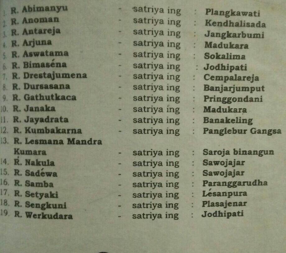 Raden werkudara satriya ing jodhipati. Raden arjuna (janaka) satriya panengahing pandhawa, putrane prabu pandhu lan dewi kunthi. Ingkang angka catur, jawata ing salendra bawana, wewisik. Raden werkudara satriya ing jodhipati; Raden kumbakarna satriya ing panglebur gangsa.